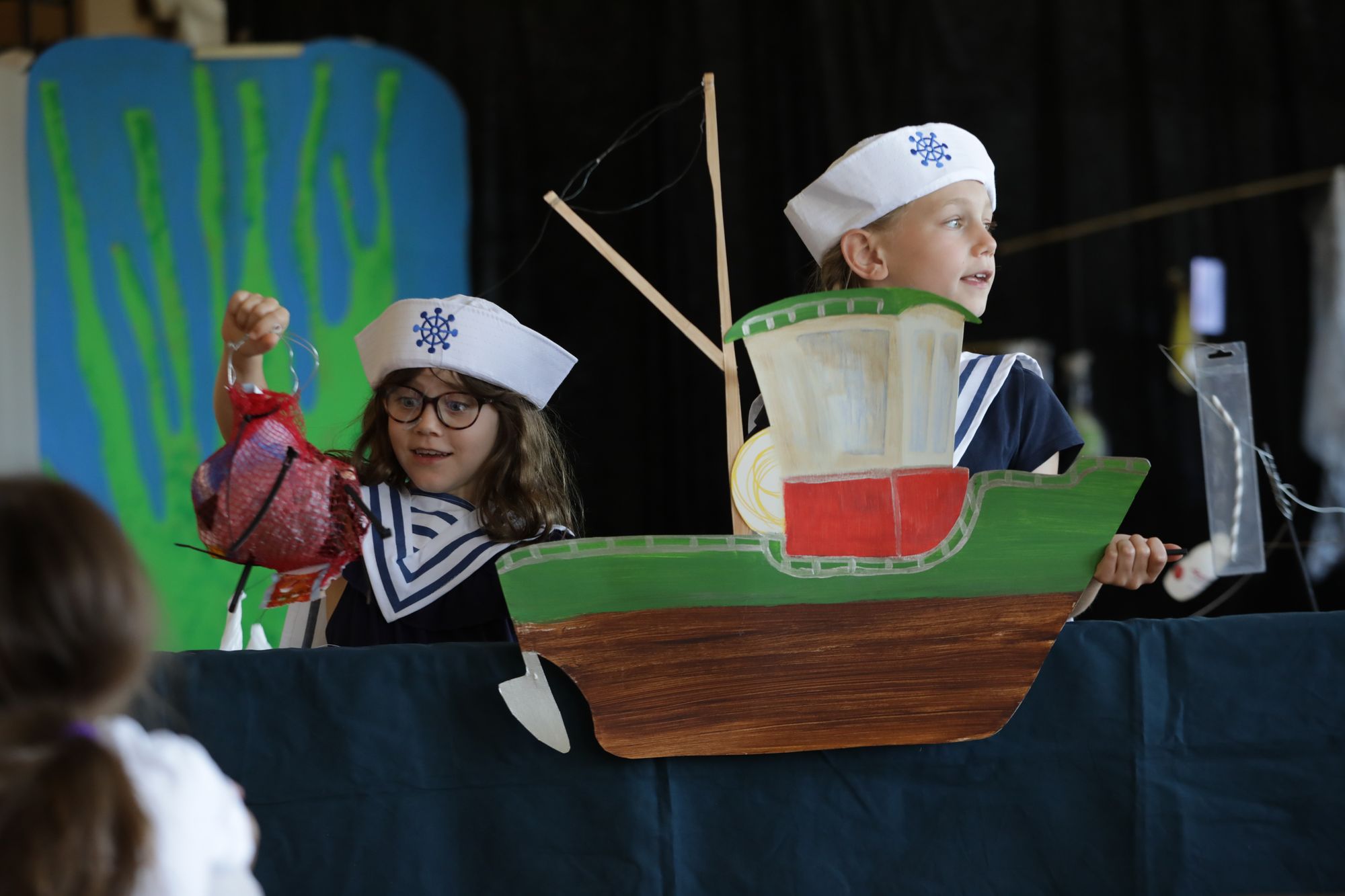 Auf der Grundlage des den Kindern bekannten Bilderbuchs „Heute bin ich“ von Mies Hout beschäftigte sich das diesjährige Projekt mit Gefühlen und wo sie uns im Alltag begegnen. Wie fühlen sich Gefühle an? Woran merke ich, wie sich jemand und wie ich mich fühle? Weil im Buch die Gefühle über Fischbilder transportiert werden, wurde zur gemeinsamen Stückentwicklung das Thema Meer und Zustand der Meere / Meeresverschmutzung hinzugenommen, welches auch im Sachunterricht aufgearbeitet wurde. Über eine bestimmte Zeit gesammelter zu Hause angefallener Müll wurde im Bühnenbild verarbeitet. In einer Projektwoche baute jedes Kind eine Stabfigur mit der Prämisse, das jeweilige vom Kind gewählte Gefühl abzubilden. Mit diesen Fisch-Figuren wurde in der Probenphase das selbst erfundene Theaterstück fixiert.